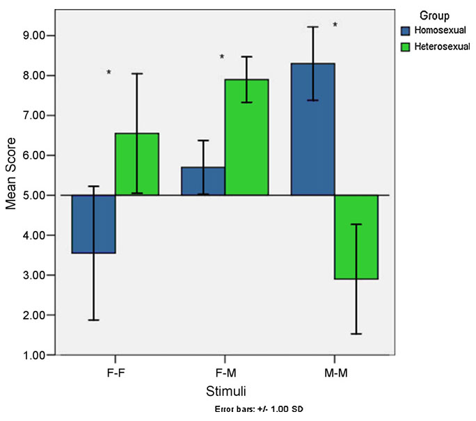 Fig 1 (Zhang et al., 2010). Mean scores of the sexual films showing F–F, F–M and M–M in the two groups. F–F and M–M stimuli induce sexual disgust, respectively. Results of two independent samples test comparisons (homosexual versus heterosexual) are displayed. Blue indicates homosexual men; green, heterosexual men; the asterisk, p less than 0.01. Error bars equal 1 SD. NOTE: the level of sexual disgust was assessed by scores from 1 (extremely high) to 4 (extremely low), and the level of sexual arousal was rated from 6 (extremely low) to 9 (extremely high).