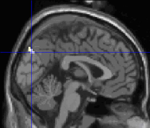 In the homosexual group, the F–F stimulus identified great activity in a large number of brain regions, including the left superior frontal gyrus, right and left medial frontal gyrus, left and right cerebellum, left middle occipital gyrus (BA 19), right lingual gyrus (BA 18), left precuneus, right middle temporal gyrus, left superior temporal gyrus (BA 38), left thalamus, and left supplementary motor area.In the heterosexual group, M–M stimuli elicited great activations in the left middle frontal gyrus, right middle frontal gyrus (BA 6), left inferior frontal gyrus (BA 45), right inferior frontal gyrus (BA 47), left middle temporal gyrus, right middle temporal gyrus (BA 37, BA 39), left superior temporal gyrus (BA 13), right superior temporal gyrus (BA 38), left inferior occipital gyrus (BA 18), bilateral caudate, bilateral thalamus, bilateral insula, left putamen, right parahippocampal gyrus, right cerebellum, right anterior cingulate (BA 42), and right amygdala.OK, so that's a bunch of areas that are activated relative to doing nothing (instead of relative to watching a neutral film). I won't try to interpret those results. How about comparing the Disgust vs. Rest responses of the gay and straight men? There was one region of the brain more active in each of the groups: left ventromedial prefrontal cortex for gay men (Fig. 4), and left cuneus [visual cortex] for straight men (Fig. 5).