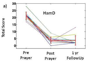 It's no surprise that a non-randomized, unblinded prayer intervention in religious persons resulted in dramatically reduced HAM-D scores in the 14 participants who completed the study (11 of whom were available for a one year followup).