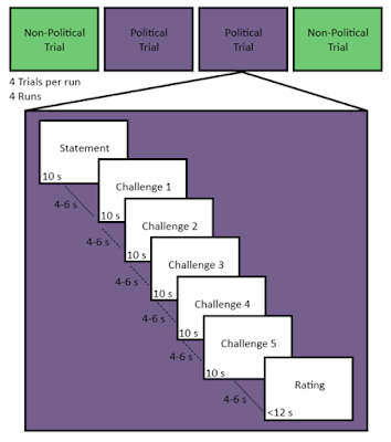 This seemed much more insightful, so I took a closer look at the paper. From the outset, one notable limitation is that no conservatives were included in the study. The only participants were politically avid young people who identified as strong liberals. They read eight political statements and eight non-political statements they strongly agreed with (as rated in a pre-scan questionnaire). Each statement was followed by five “challenges” that presented a counter-argument. Then they rated their belief in each statement on a scale of 1 (strongly disbelieve) to 7 (strongly believe).